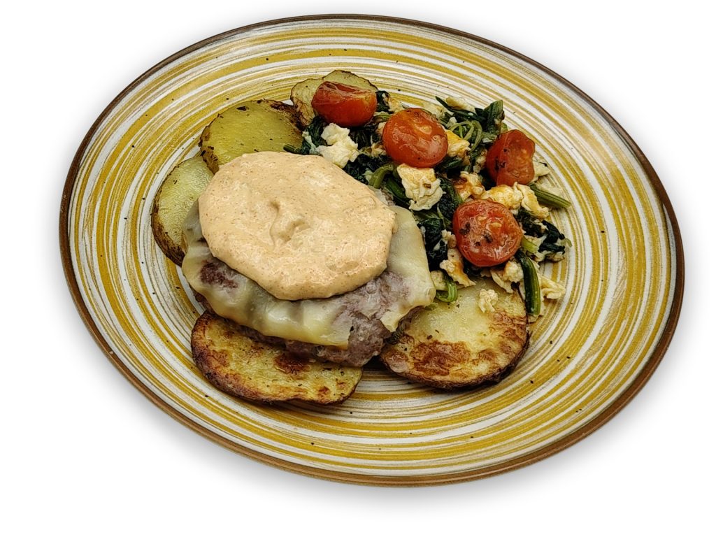 Burger de ternera con salsa especial de pepinillos, scamorza, patata panadera, cherrys asados y revuelto de espinacas