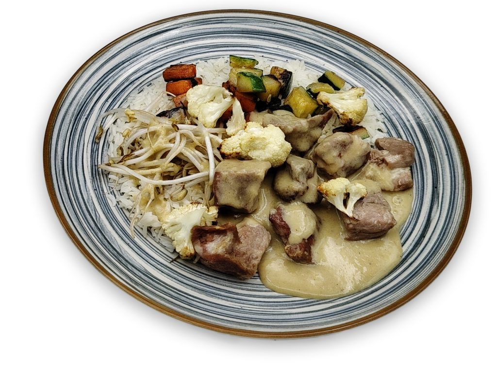 Curry verde de cerdo con arroz, brotes de soja, calabacín, zanahoria y coliflor asada