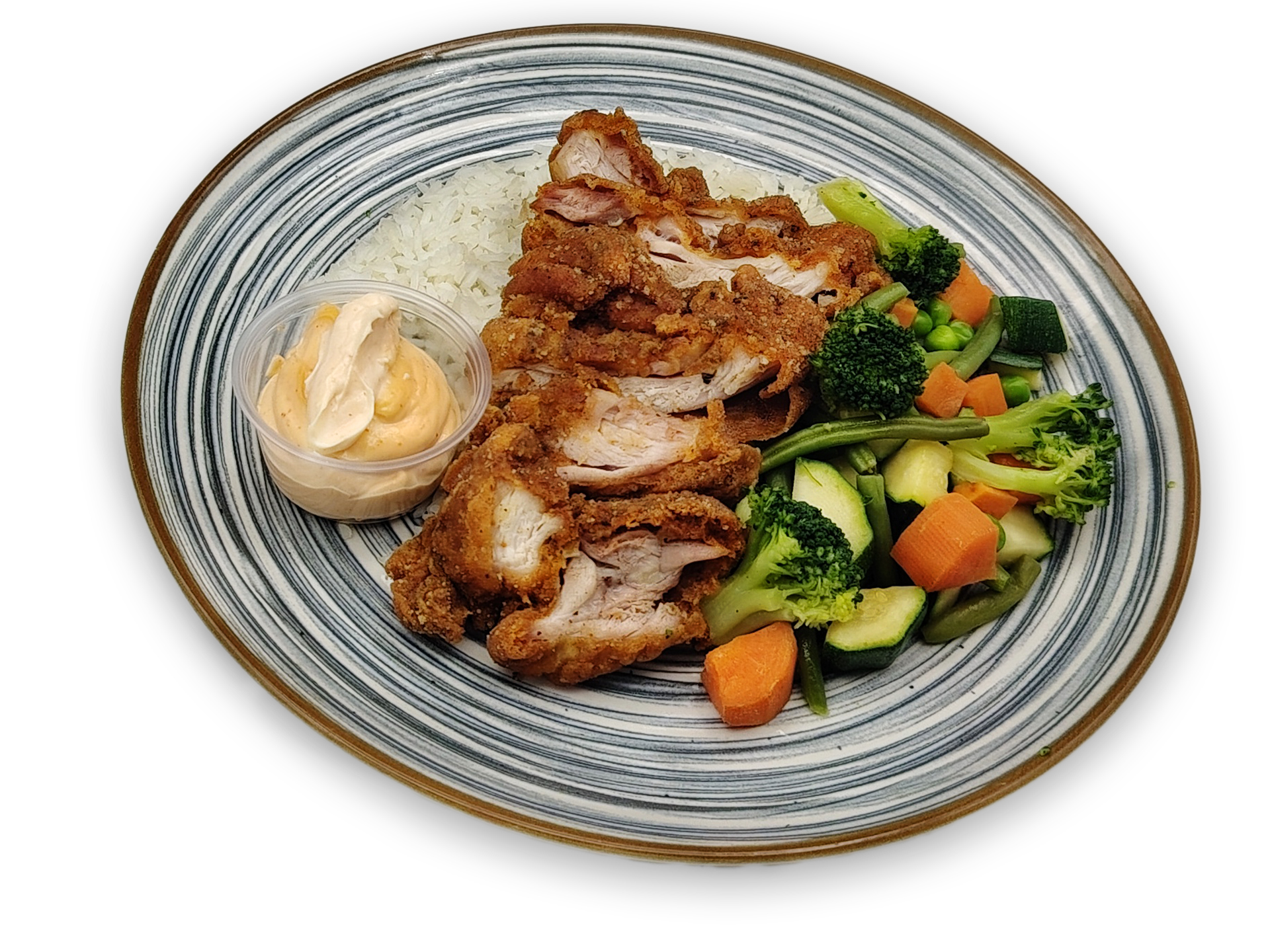 Pollo kentucky con mayo sriracha, arroz y menestra de verduras al vapor