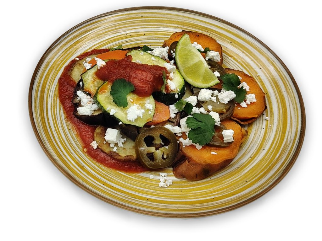 Timbal de verduras con salsa de tomate casera y boniato asado con queso feta, jalapeño, cilantro y lima